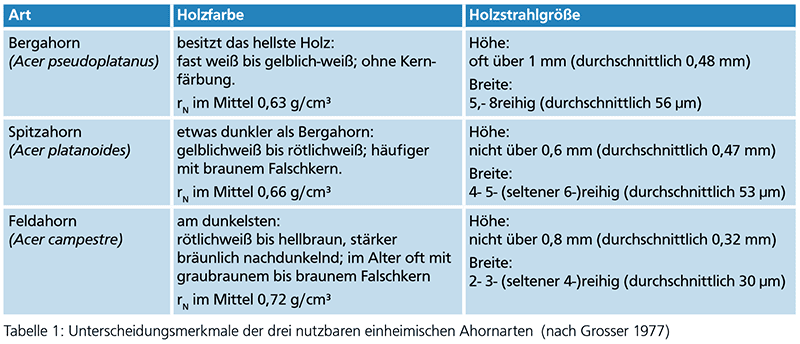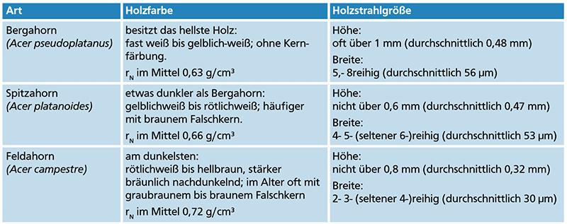 Im Unterschied zu Bergahorn und Spitzahorn weist der Feldahorn deutlich schmälere Holzstrahlen (2- bis 4-reihig) auf (Abb. 7, Tab. 1). Auf den Radialflächen erscheinen die Holzstrahlen als zahlreiche rötlichbraune, glänzende Spiegel, die das Holzbild in charakteristischer Weise beeinflussen. Insgesamt sind die Längsflächen fein gefladert (Tangentialschnitt) bzw. fein gestreift (Radialschnitt). Häufiger kommen mehr oder weniger vereinzelt Markflecken vor, mitunter als Leberflecken bezeichnet. Gehobelt ergibt sich ein schöner seidenartiger Glanz, ein spezieller Geruch fehlt.
