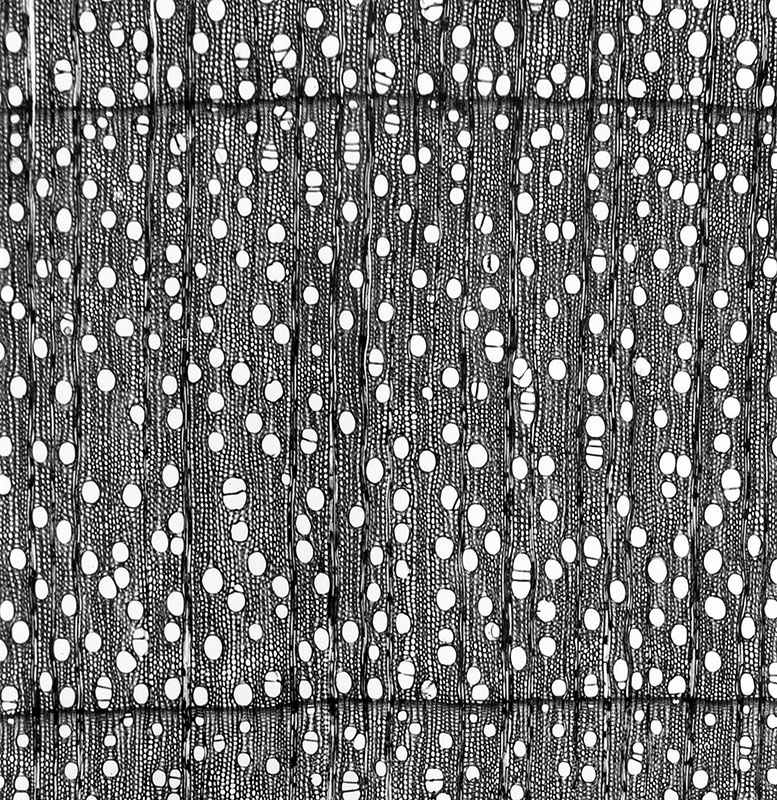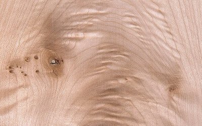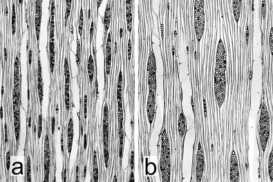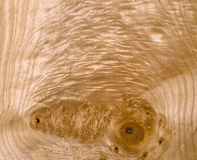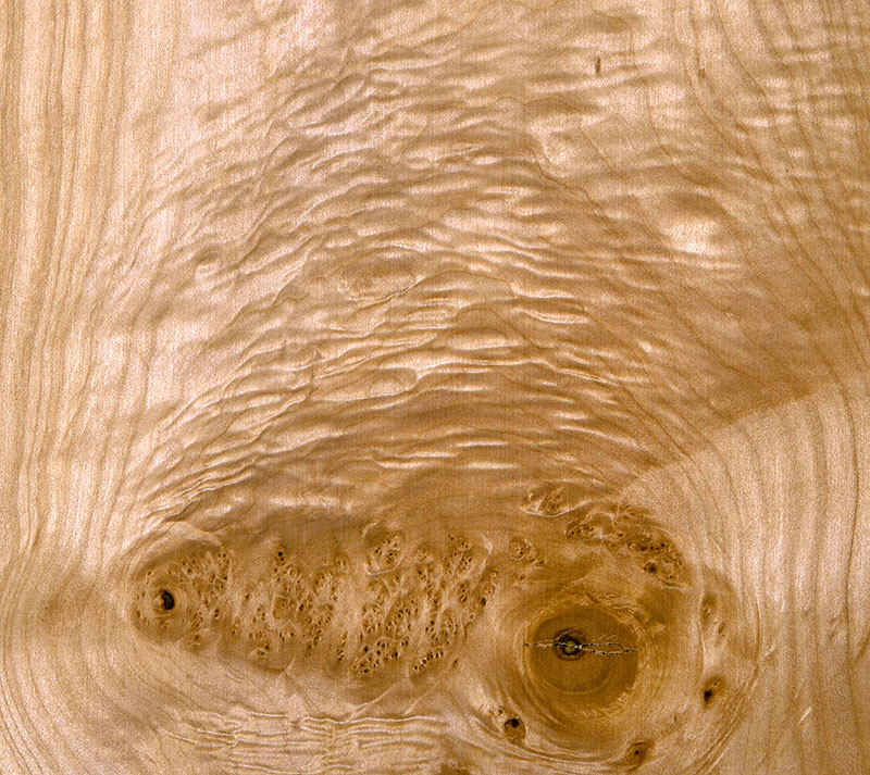 Untere Stammabschnitte zeigen vielfach einen wimmerigen Verlauf der Holzfaser wie auch einen Maserwuchs in Form deutlich voneinander abgesetzter Maserplatten. Insbesondere das maserwüchsige Holz ist äußerst dekorativ, entsprechend hochgeschätzt und damit als Furnierholz auch hochbezahlt (Abb. 3, Abb. 4).