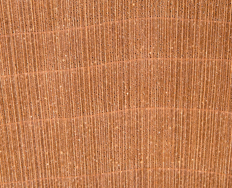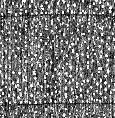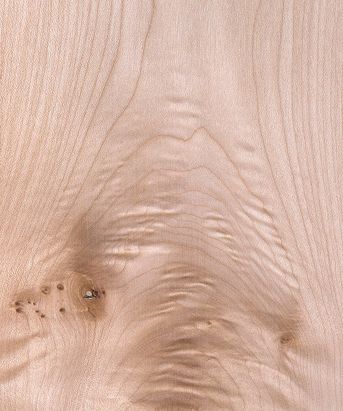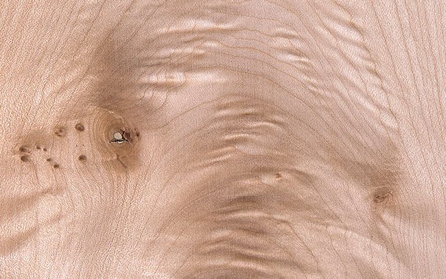 Hellfarbiges, äußerst homogen strukturiertes Laubholz mit zerstreut angeordneten, feinen Poren, deutlichen Jahrringgrenzen und rötlichbraunen Spiegeln; dezent gefladert bzw. gestreift. Untere Stammabschnitte oft wimmerwüchsig und/oder gemasert.