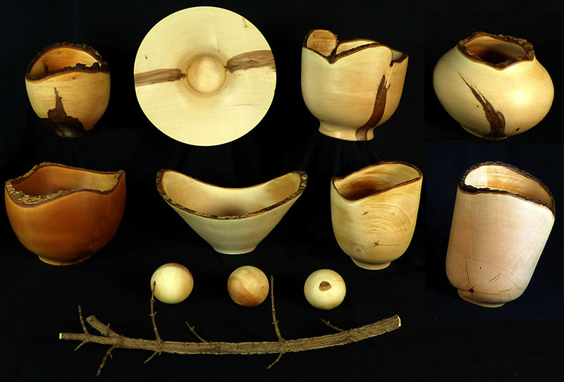 Abb. 11: Aus Feldahorn gedrechselte Schalen und Gefäße in unterschiedlicher Gestaltung mit Holzkugeln und einem für Feldahorn typischen Trieb mit Korkleisten (Foto: G. Hornbostel)