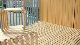 Abb. 6. Holz im Aussenbereich: Die Fassade mit speziellem Anstrichsystem, welches mikrofibrillierte Zellulose als Verstärkungs- und Trägermaterial für aktive Substanzen erhält, ist Wetter und UV-beständig. Es bilden sich weniger Risse und aussedem ist die Fassade vor Mikroorganismen geschützt. Die Balkonmöbel bestehen aus einem neuartigen Bambuskomposit-Material. Foto: Doris Hölling (WSL)