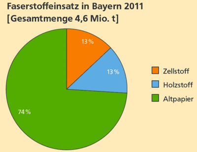 Die Papierindustrie stellt etwa 3.000 verschiedene Papiersorten her. Die bayerische Papier- und Verpackungsindustrie produziert jährlich etwa 4,6 Millionen Tonnen Papier, rund 17 Prozent der deutschen Papierproduktion. Mit über 70 Prozent lagen 2011 die grafischen Papiere in Bayern an der Spitze, gefolgt von den Verpackungspapieren (24 %). Hygiene-, Spezial- und Technische Papiere stellten den kleinsten Anteil in der Papierproduktion. Altpapier ist dabei der am meisten verwendete Faserstoff, die Frischfasern Zellstoff und Holzstoff sind gleichwertig vertreten (Abb. 1).