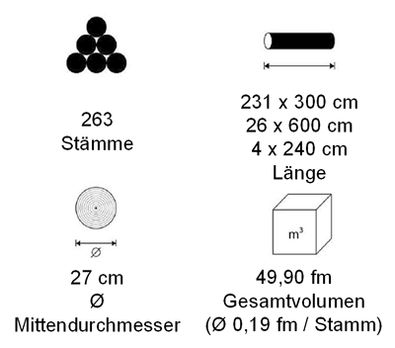 Über 200 aus NRW stammende Birken-Stammholzabschnitte mit einer Bestelllänge ab 3,0 Metern, Stkl. 2a–2b+, Gkl. B/C wurden dazu aus den Forstbetriebsbezirken Velen, Arnsberg und Bottrop geliefert sowie in einem Sägewerk nach unterschiedlichen Qualitäten1 sortiert und zu Brettern (sog. Schnittholz) weiterverarbeitet.
