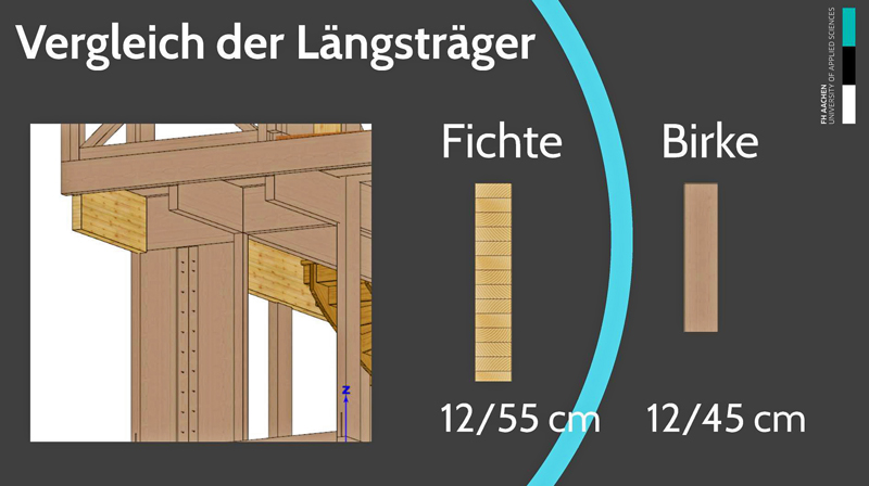 Die Planung und der Entwurf des zweigeschossigen Ausstellungsstandes aus Birken-BSH erfolgte in Kooperation mit der Fachhochschule Aachen (FH Aachen) im Rahmen des Moduls CAE Holzbautechnologie. Zwei Teams des Studiengangs Holzingenieurwesen präsentierten dazu in einem Wettbewerb zwei Entwürfe, aus denen die Jury einen Gewinner ausgewählt hat. Das zweigeschossige Vorführmodell des Teams "Birke", das bis Juni 2022 realisiert wird, wird unter anderem in der Ausstellungshalle im Zentrum HOLZ in Olsberg zum Einsatz kommen. Es wird anschaulich die Vorteile von Brettschichtholz aus Birke im Vergleich zu Brettschichtholz aus Fichte aufzeigen, welche zum Beispiel in der höheren Dichte liegen. Mit der Birke können somit schlanke Trägerkonstruktionen und Wände realisiert werden, ohne dass diese an Festigkeit verlieren. Damit einher geht eine Volumen- und somit Materialersparnis in der Konstruktion.