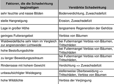 Tab. 1: Übersicht über Faktoren, die die Schadwirkung der Waldweide begünstigen (Königer et al. 2005).