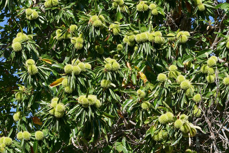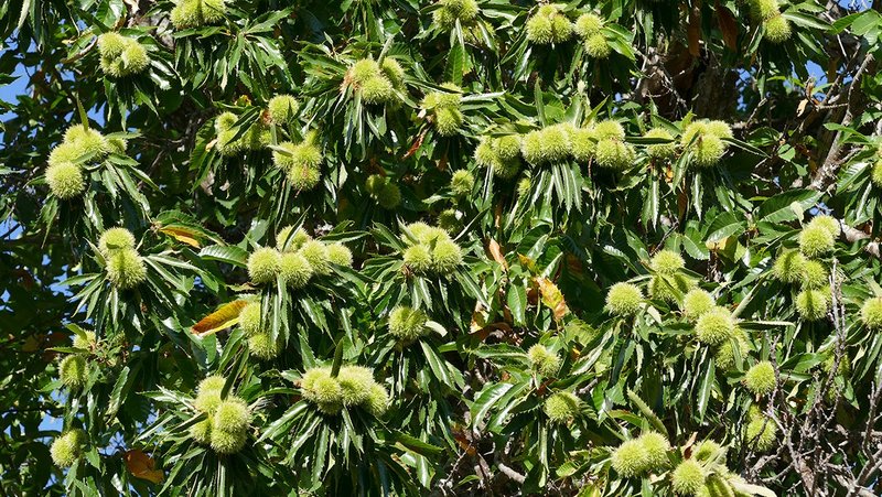 Abb. 1. Die Kastanien reifen in stacheligen Fruchtbechern (Cupulae) hoch in den Bäumen. Nicht zuletzt deshalb ist die Ernte der teuerste Teil der Kastanienproduktion. Foto: Thomas Reich (WSL)