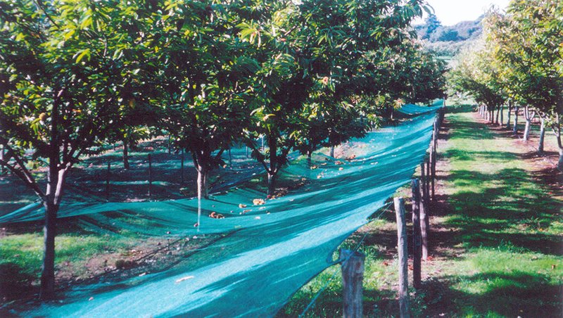 Abb. 4. Ernte mit aufgespannten Netzen. Ernteanlage mit Netzen in einem modernen Kastanienhain in Frankreich. Foto: Agroscope RAC Changin Centro di Cadenazzo (A. Sassella).