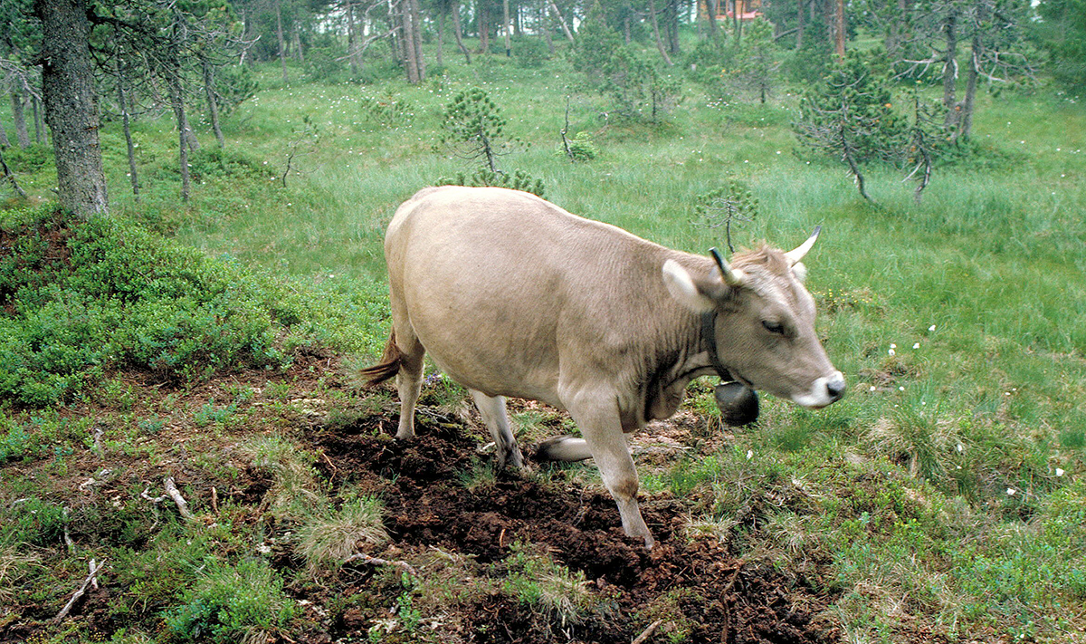 Weidende Tiere können durch Tritt (Abb. 3) und Verbiss die Regeneration des Waldes sowie seine Struktur und seine Funktionen beeinträchtigen. Auf sieben Waldweiden im Dischmatal bei Davos zeichneten die Wissenschaftler auf, wie häufig und wie stark junge Fichten, Lärchen und Vogelbeeren beschädigt wurden. Die beobachteten Änderungen bevor und nachdem die Tiere weideten, interpretierten die Forscher als Verletzungen durch das Weidevieh.