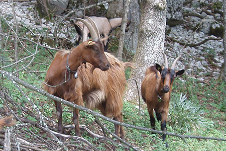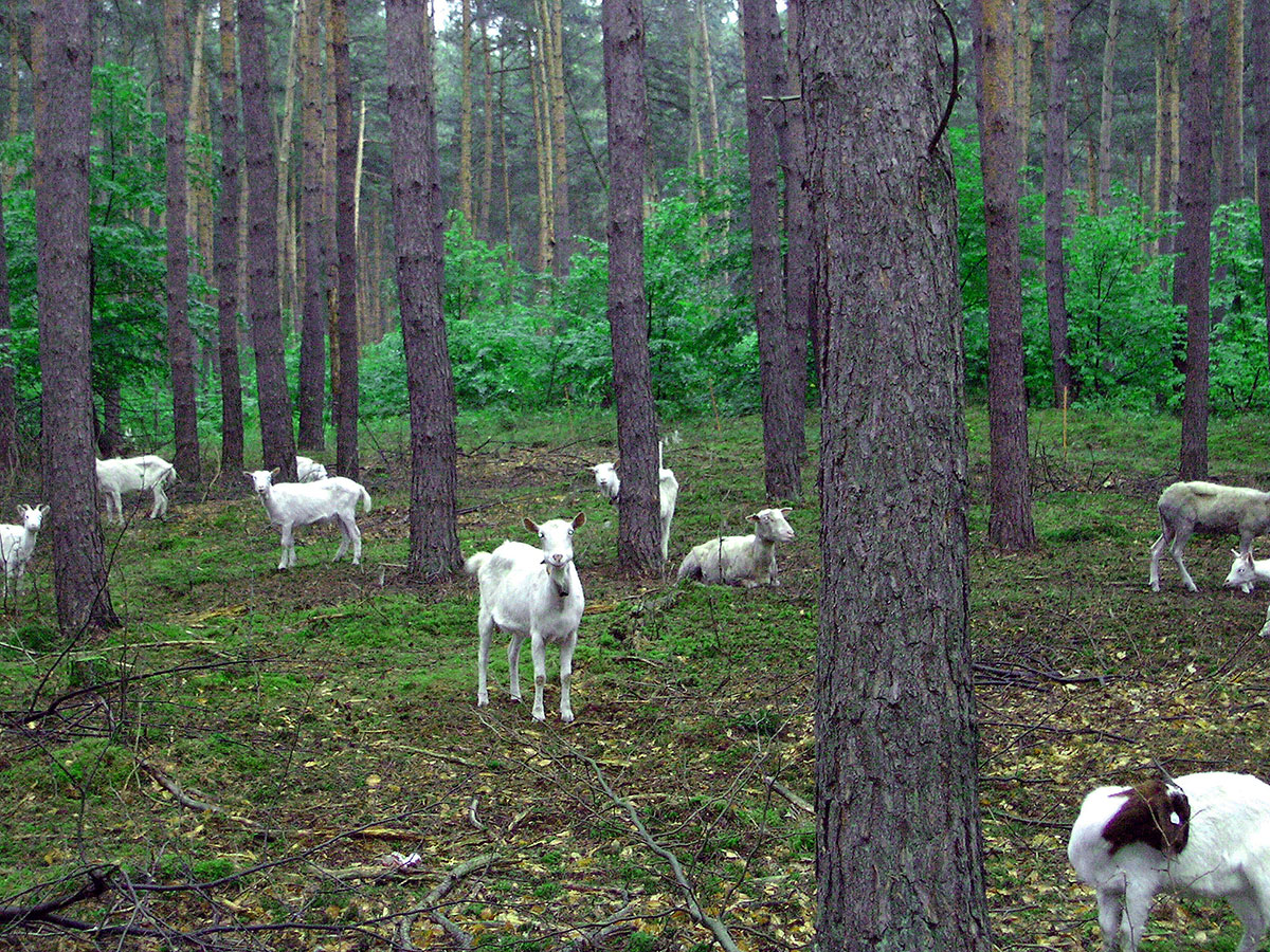 Abb. 2: Der Naturschutz hat die Waldweide als landschaftspflegerisches Element entdeckt: Ziegen im Schonwald Reilinger Eck bei Schwetzingen. Mit Hilfe der Beweidung sollen Problempflanzen wie Brombeere, Spätblühende Traubenkirsche und Landreitgras zurückgedrängt werden, um wieder neue Lebensmöglichkeiten für die konkurrenzschwachen Arten der Sand-Kiefernwälder entstehen zu lassen (Foto: Th. Dieterle, vfs-freiburg).