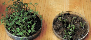 Abb.1: Kresseaustrieb bei einem unbelasteten und einem mit Herbizid belasteten Boden.