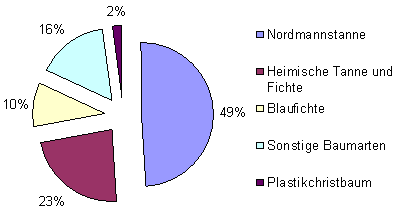 Ausgehend von den unterstellten prozentuellen Baumartenanteilen ergibt das in Summe 980.000 Nordmannstannen, 460.000 heimischen Tannen und Fichten, 200.000 Blaufichten, 320.000 sonstige Baumarten sowie 40.000 Plastikbäume.