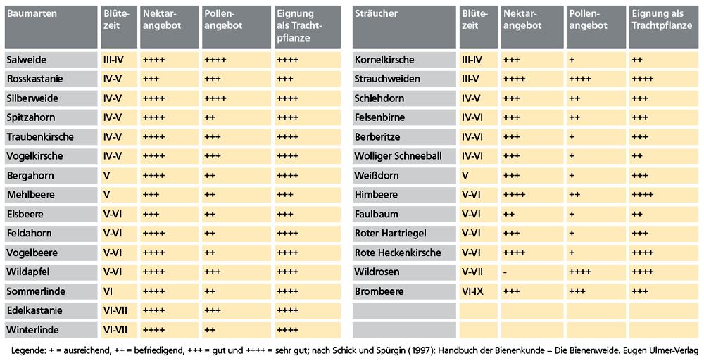 Durch Pflanzung oder gezielte Pflegemaßnahmen können Baumarten mit hohem Nektar- und Pollenangebot gefördert werden. Voraussetzung dabei ist, dass die Baumarten auch für den jeweiligen Standort geeignet sind. Viele Baum- und Straucharten eignen sich hervorragend als Bienenweide (Tab. 1). Einige Arten sind von waldbaulicher Bedeutung (Berg- und Spitzahorn, Vogelkirsche, Elsbeere, Lindenarten), andere eignen sich für artenreiche und attraktive Waldinnen- bzw. -außenränder (Weiden, Rosskastanie, Mehlbeere, Feldahorn, Vogelbeere, Wildapfel). Kombiniert man dabei Baumarten mit unterschiedlichen Blühzeitpunkten, kann ein kontinuierliches Trachtangebot sichergestellt werden.