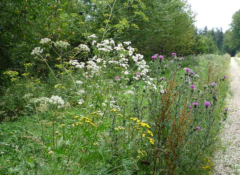 Auch Waldinnenränder können attraktive Lebensräume für Bienen sein. Bleiben die Seitenstreifen entlang der Wege gehölzfrei, kann sich hier eine üppige krautige Vegetation entwickeln (Abb. 1). Auch aus forstbetrieblicher Sicht sind Seitenstreifen entlang der Forstwege sinnvoll. Sie können zur Lagerung von Holz genutzt werden und gewährleisten ein rasches Abtrocknen des Wegekörpers, was Wegeschäden vorbeugen kann.