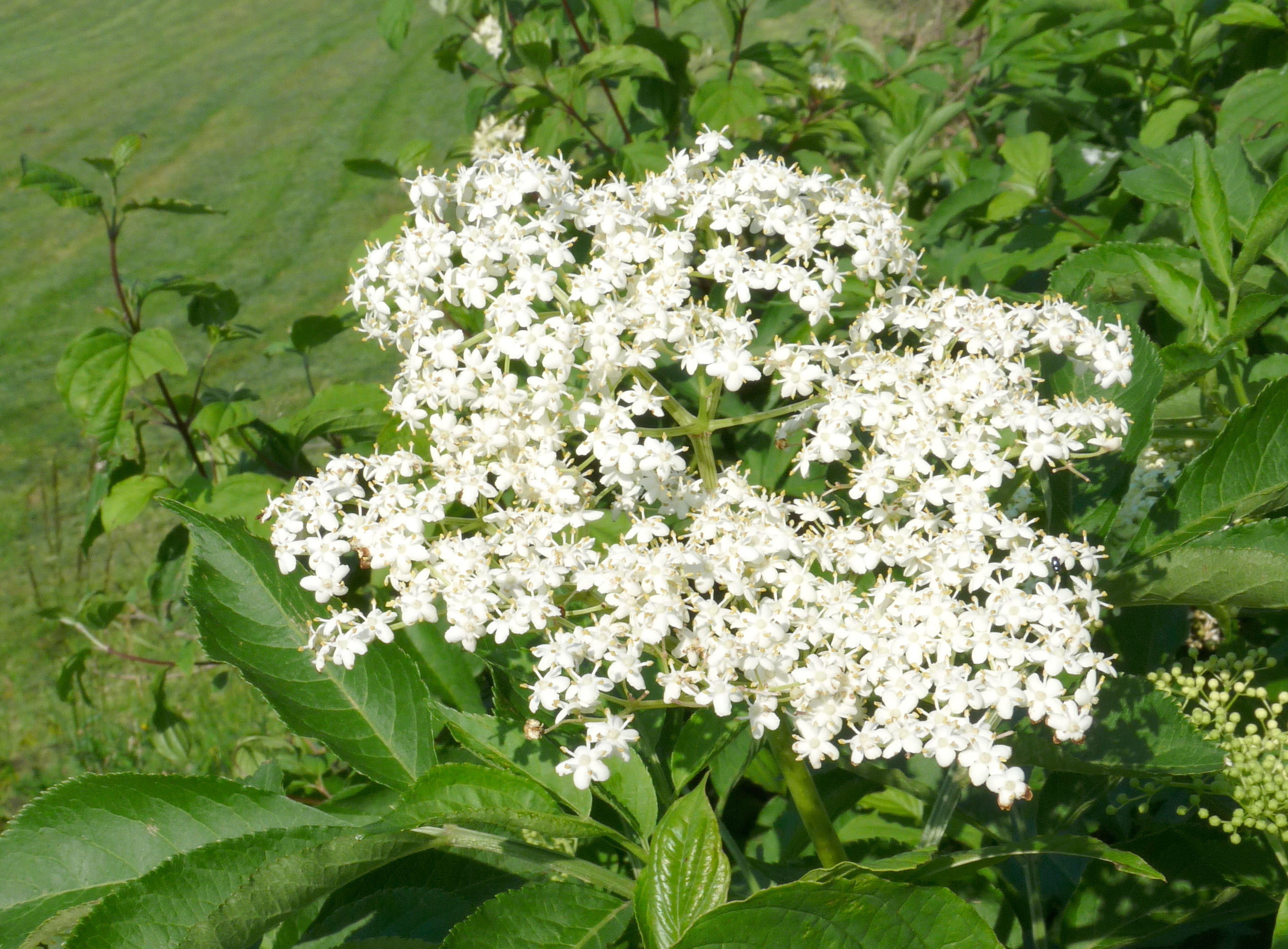 Der bis gegen 8 m hohe Schwarze Holunderstrauch, im Volksmund unter anderem auch "Tintebeeri" genannt, gehört zur Familie der Geissblattgewächse und gedeiht vom Mittelland bis etwa 1400 m ü. M. In tiefen Lagen ist er wesentlich häufiger anzutreffen als der bis etwa 4 m hohe Rote Holunder. Von diesem unterscheidet er sich unter anderem durch die hellere Rinde, aber insbesondere durch das reinweisse Mark, das beim Roten Holunder gelbbraun ist. Im Juni/Juli trägt der Schwarze Holunder weisse Blüten.