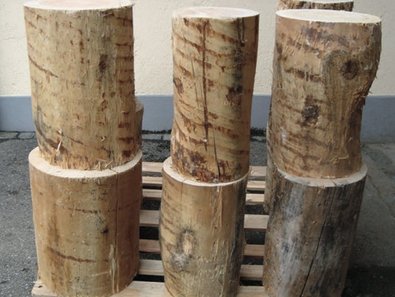 Abb. 3 - Qualität des Holzwolle-Rohholzes (von links nach rechts): A-Qualität: hell, geradewüchsig, kaum Äste; B-Qualität: hell, leicht drehwüchsig, wenig Äste; C-Qualität: nicht verfärbt, drehwüchsig, astig. Das verfärbte Beispiel rechts unten ist nicht zur Produktion von Holzwolle geeignet.
