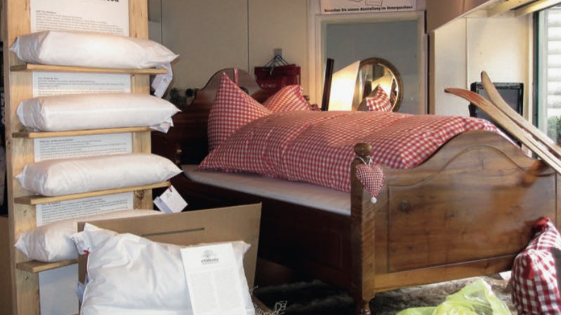 Abb. 5 - Kopfkissen mit Mondphasen-Holz von Apfelbaum, Waldkirsche, Föhre oder Arve in der Nackenrolle knüpft an einen alten Einsatzbereich der Holzwolle an. Foto: Lindner Suisse GmbH