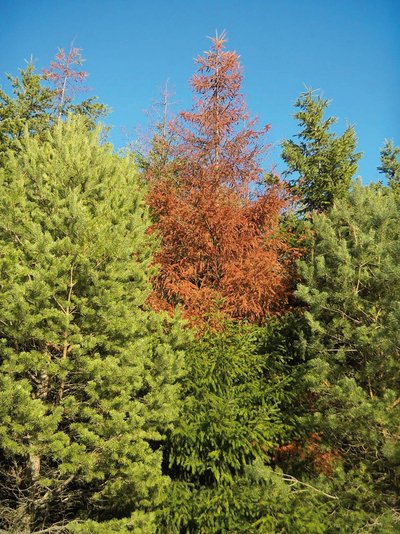 Neben dem Einsatz heimischer Mischbaumarten werden zwei weitere Strategien als notwendig angesehen: Die Einbringung von Herkünften heimischer Baumarten aus wärmeren, trockeneren Regionen (assisted migration) und der Einsatz nicht-heimischer Baumarten (Siehe Artikel "Assisted Migration"). Es empfiehlt sich ein Blick aus der Sicht des Waldschutzes, um damit verbundene Risiken besser abschätzen zu können. Zwei Aspekte sind besonders zu beachten: Nicht-heimische Baumarten können von bei uns heimischen Schadorganismen befallen werden oder neue Schadorganismen aus dem Heimatgebiet mitbringen. Und nachdem Waldumbau auch mit intensivem Austausch von Pflanzenmaterial verbunden ist, kann dies zur Quelle für die Verschleppung von Schadorganismen werden.