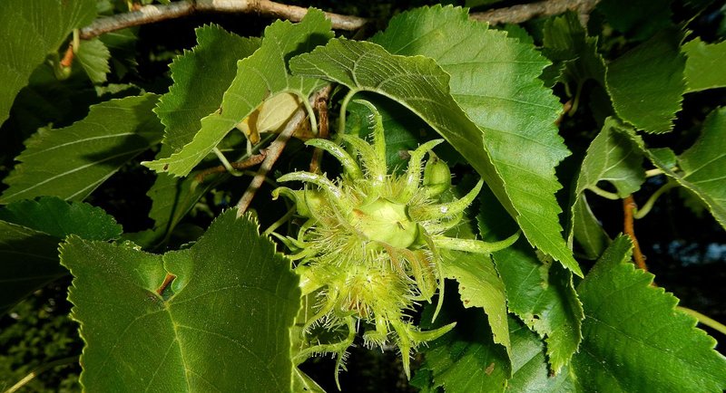 Abb. 1: Blätter und Frucht der Baumhasel (Foto: Klaus Stangl).