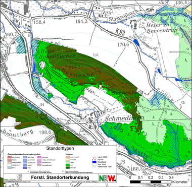 Bei den auf der Fläche vergesellschafteten Böden handelt es sich um Rendzinen, Braunerde-Rendzinen und Braunerden verschiedener Entwicklungstiefe. Flachgründige Böden mit einer nutzbaren Wasserspeicherkapazität (nWSK) von 50-75 mm finden sich auf konvexen Hangbereichen, während tiefgründige Böden mit einer nWSK von über 200 mm sich in muldigen Lagen und am Unterhang gebildet haben. Der Gesamtwasserhaushalt der Flächen als Ergebnis der Standortklassifikation ist in Abb. 5 (Szenario 0) dargestellt. Er wurde als trocken bis frisch für den untersuchten Buchenbestand eingeschätzt. Die Mineralstoffversorgung wurde je nach Ausgangsgestein mit mittel (Braunerden) bis gut (Rendzinen und basenreiche Braunerden) bewertet.