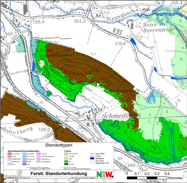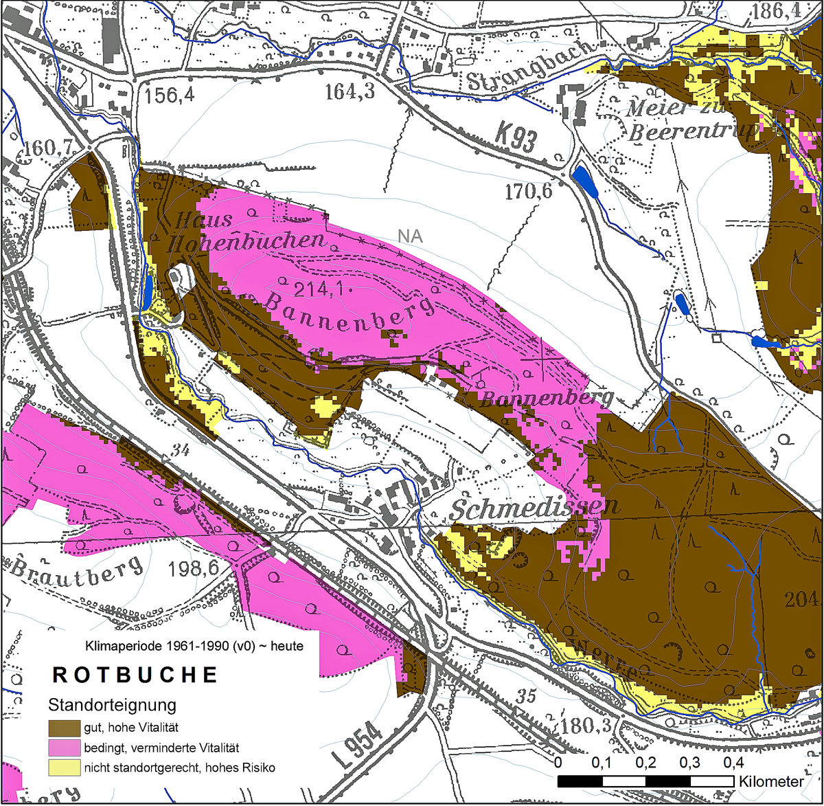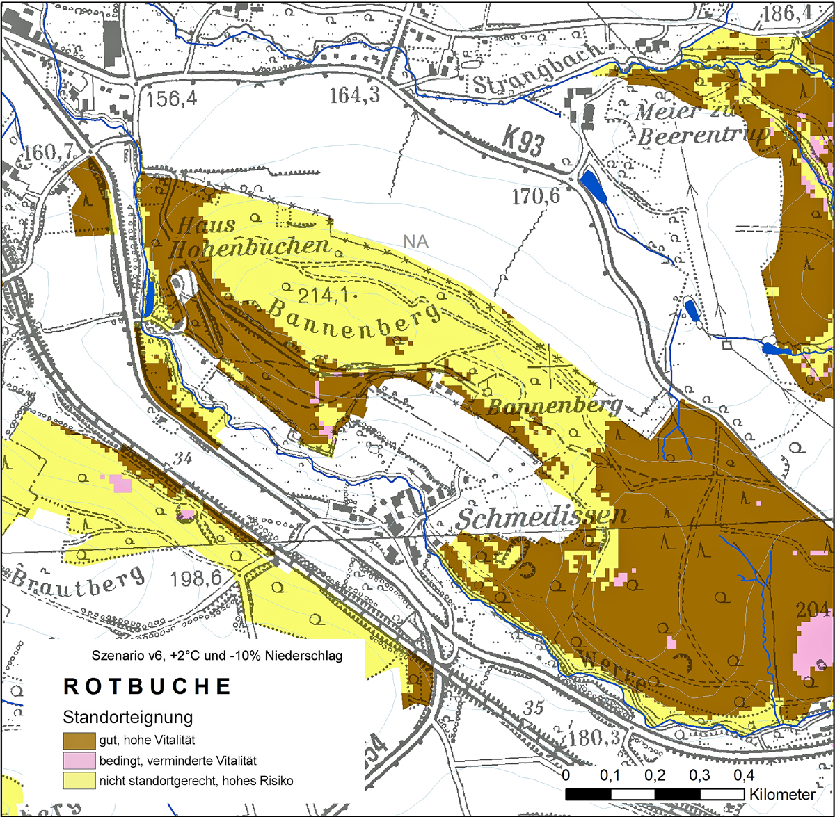 Das veränderte Klima bzw. die veränderte Witterung im Raum Detmold hat deutliche Auswirkungen auf den Gesamtwasserhaushalt der Waldstandorte. Um eine Vorstellung von den Auswirkungen derartiger Veränderungen auf den Wald bzw. die Waldstandorte zu bekommen, wurden von der Forstlichen Standorterkundung NRW Klimaszenarien gerechnet (Asche 2017). Nutzt man das Szenario +2 °C und -10 % Niederschlag, kommt es zu einer Verschiebung der Gesamtwasserhaushaltsstufe. Flächen, die unter Nutzung der Klimadaten der Periode 1961-1990 als mäßig frisch eingestuft wurden, werden in dem Szenario den mäßig trockenen Bereichen zugewiesen. Diese Verschiebung hat dann auch Auswirkungen auf die Standortgerechtheit der Rotbuche: Flächen, auf denen sie ursprünglich als bedingt standortgerecht eingestuft wurde, lassen bei den geänderten Standortmerkmalen eine verminderte Vitalität erwarten. Sie wird bei dem hier genutzten Szenario als nicht mehr standortgerecht eingestuft. An Unterhängen und Flächen mit einer hohen nWSK wird die Rotbuche auch bei den veränderten Klimamerkmalen als voll standortgerecht eingeschätzt (Abb. 8). Jedoch sind hier Schäden auch in Jahren mit einer extremen Witterung zu erwarten (Manion 1981) und sind unter den Gegebenheiten des Jahres 2018 eingetreten.