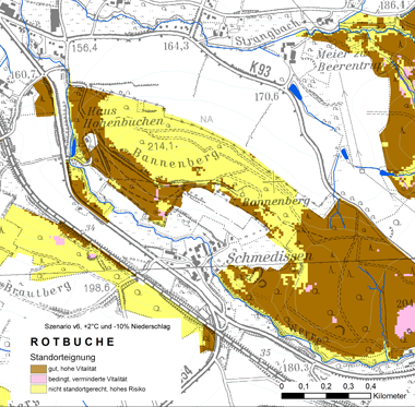 Ausgehend von diesen Standortmerkmalen und den Standortansprüchen der Rotbuche wird der untersuchte Bestand als voll standortgerecht eingeschätzt (Abb. 5b, Szenario 0). Auf östlich angrenzenden Flächen (Rendzinen und Baunerde-Rendzinen) mit einem trockenen bis mäßig trockenen Gesamtwasserhaushalt ist die Buche nur als bedingt standortgerecht eingeschätzt worden (Asche 2001). Hier besteht jedoch die Vermutung, dass die Bäume Gesteinsklüfte tief durchwurzeln und somit höhere Bodenwasservorräte nutzen können, als im Rahmen bodenkundlicher oder standortkundlicher Erhebung abgeschätzt wird. Ansonsten ist die auch auf diesen Flächen gute Wuchsleistung der Buche nicht zu erklären.