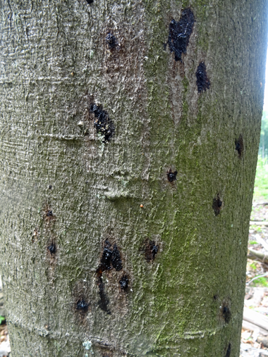 Abb. 3: Durch Einbohrungen des Buchenborkenkäfers verursachte Schleimflussflecken an einem Buchenstamm. Foto: N. Asche