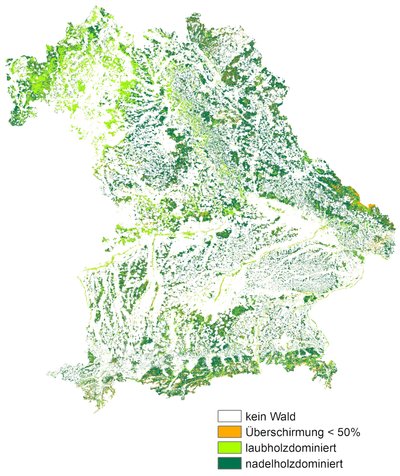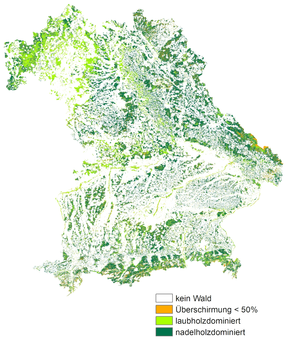 Auf der Grundlage von Sentinel-2 Bilddaten und Stichprobenkreisen der Forsteinrichtung im Staatswald wurden für ganz Bayern laub- und nadelholzdominierte Waldflächen erfasst. Die flächige Klassifizierung erfolgte mittels dem Modellierungsverfahren Random Forest, welches eine häufig angewandte Technik aus dem Bereich des "Maschinellen Lernens" ist. Dabei wurden mehr als 63.000 Stichprobenkreise der Bayerischen Staatsforsten zur Entwicklung von mehreren regional angepassten Modellen genutzt.