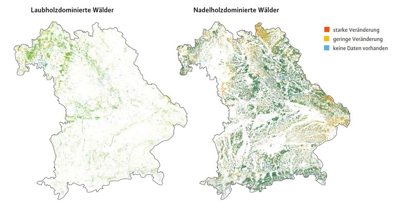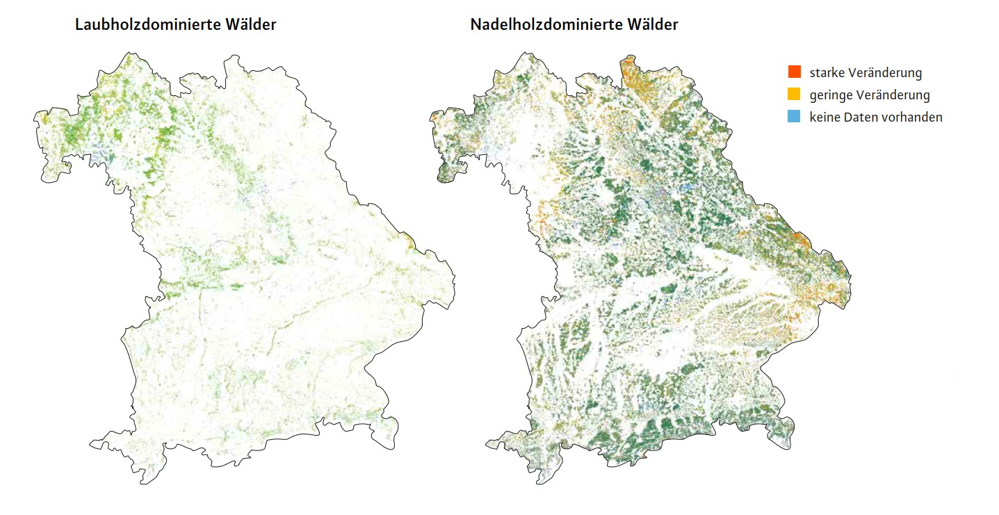 Veränderungen im Nadelwald wurden vor allem im vom Borkenkäferbefall betroffenen Frankenwald und in weiteren Bereichen von Unter-, Mittel- und Oberfranken festgestellt. Auch in Niederbayern zeigen sich Veränderungen im Nadelwald, hier vor allem in den Waldgebieten, welche 2017 von Sturm "Kolle" geschädigt wurden.
