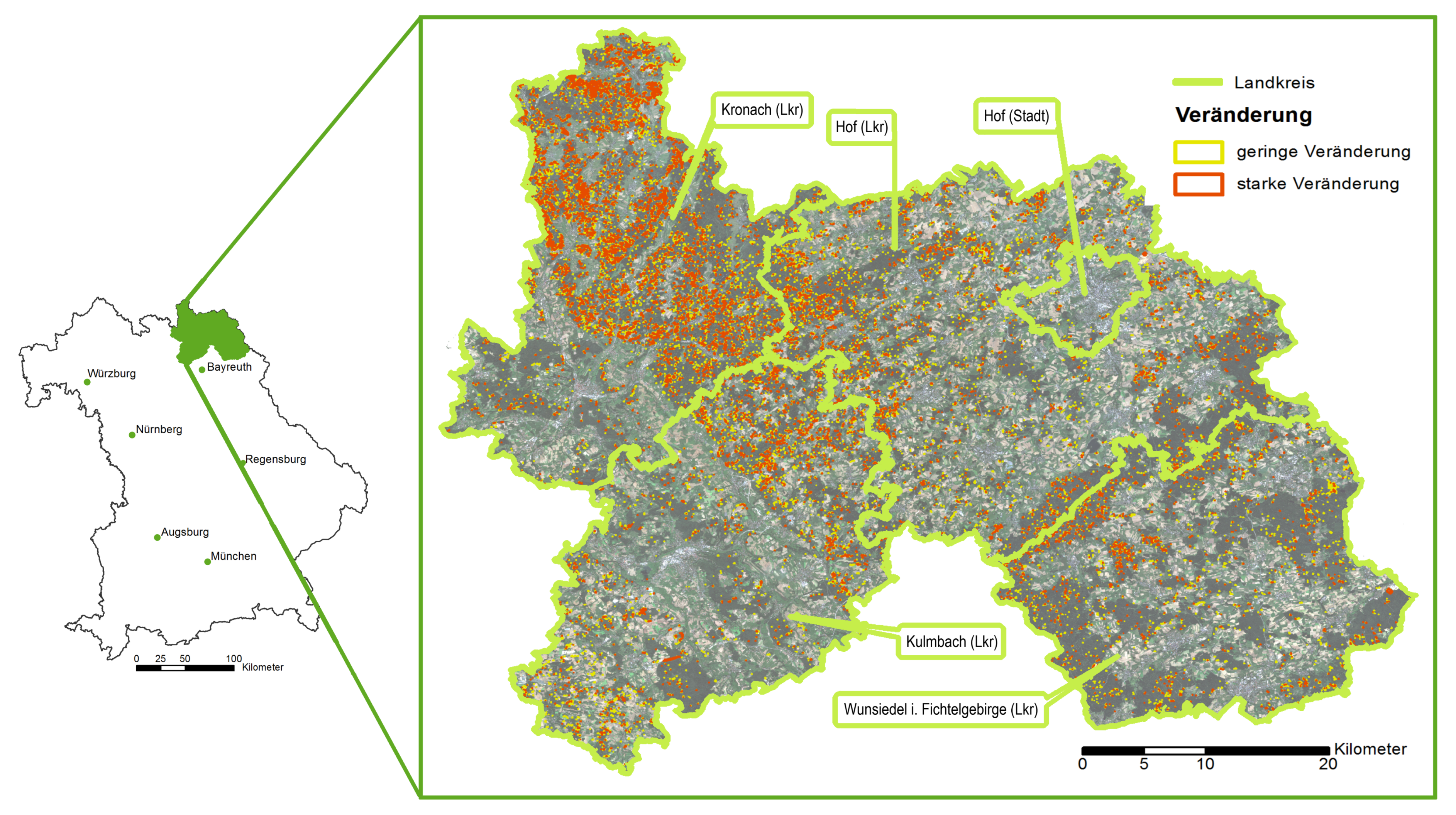 Für den Frankenwald (ÄELF Kulmbach und Münchberg) wurde eine Veränderungsanalyse für den Zeitraum September 2019 bis September 2020 durchgeführt (Abbildung 3), um die vom Borkenkäfer geschädigten Flächen zu detektieren. Theoretisch wird auch durch reguläre Hiebsmaßnahmen die Spektralinformation in den Satellitendaten verändert. Allerdings fanden im Frankenwald in diesem Zeitraum aufgrund der Borkenkäferkalamität und des historisch geringen Holzpreises nahezu keine normalen Holznutznutzungen statt.