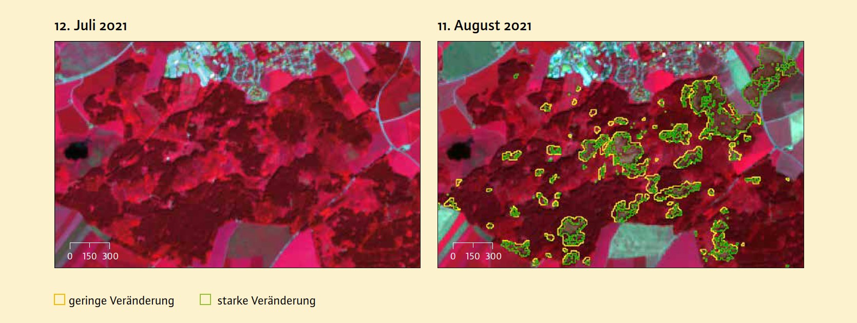 Um das Schadausmaß nach Stürmen oder durch Borkenkäferbefall besser erfassen zu können, werden an der LWF sogenannte Veränderungsanalysen (engl.: "Change detection") unter Verwendung von Sentinel-2 Daten durchgeführt.