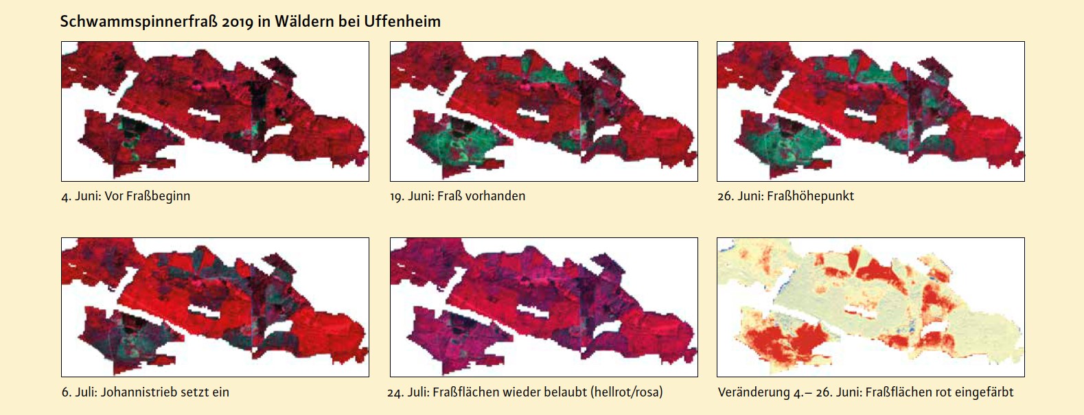 Die Satellitenbilder von Sentinel-2 werden auch für verschiedene Monitoringsansätze verwendet. In den Jahren 2018, 2019 und 2020 kam es zu einer Massenvermehrung des Schwammspinners in Teilen der Eichenwälder Frankens. Mit Sentinel-2 Daten war es möglich, den Kahlfraß im Jahr 2019 von einsetzendem Fraßbeginn Anfang Juni bis zum Wiederaustrieb der Blätter ("Johannistrieb") Ende Juni / Anfang Juli zu dokumentieren (Abbildung 6).
