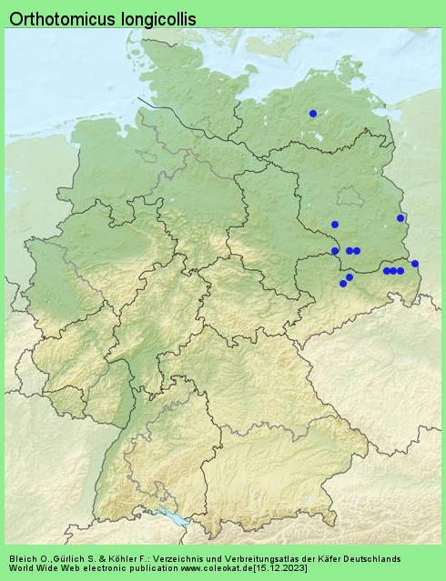 Die Auswirkungen der erwarteten und in den vergangenen Jahren bereits deutlich spürbaren Klimaänderungen auf die Waldschutzsituation sind sehr vielgestaltig. Das gilt hinsichtlich der Baumvitalität und für abiotische und biotische Schadursachen. Bei Insektenarten zeigt sich das sowohl für bereits als Schaderreger bekannte aber auch für bisher nicht entsprechend eingestufte Arten anhand von Änderungen in ihrer bisher bekannten Lebensweise. Einsolcher Effekt ist die Zunahme der Populationsdichten und eine Arealerweiterung von lokal vorhandenen aber bisher nicht relevanten Arten mit einem entsprechenden Schadpotenzial wie beispielsweise dem in den Medien teils sehr präsenten Eichen-Prozessionsspinner. Der Langhalsborkenkäfer Orthotomicus longicollis als bisher eher unbekannte Art mit in Deutschland vergleichsweise eingeschränktem Verbreitungsareal überwiegend in der südlichen Nieder- und nördlichen Oberlausitz (s. Abb. 1), ist möglicherweise ein weiteres Beispiel für eine derartige Entwicklung in Kiefernbeständen.