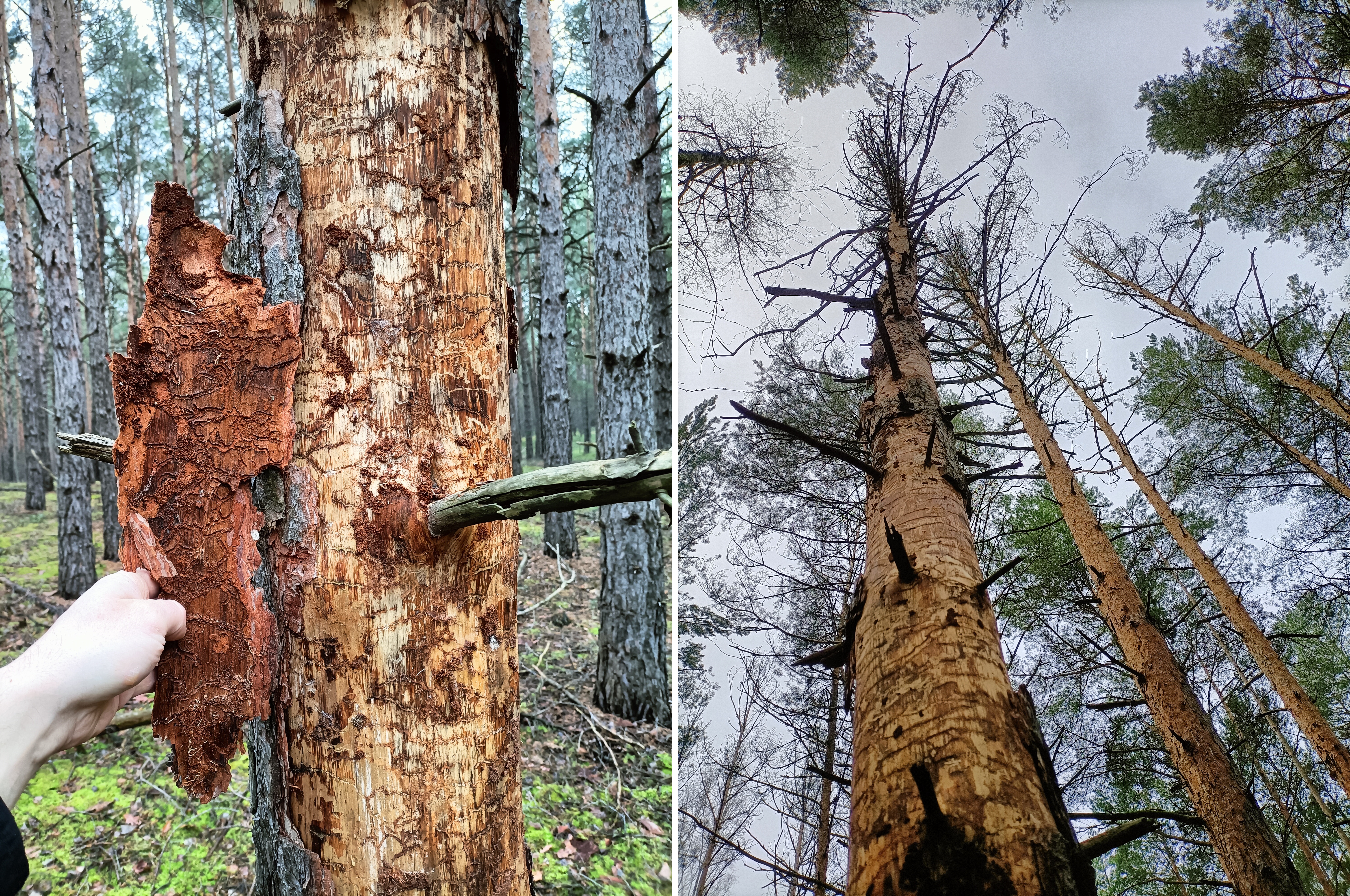 Die aktuelle Waldschutzsituation in den nordsächsischen Kieferngebieten ist seit 2018 analog zur Situation in den Fichtengebieten durch eine Massenvermehrung holz- und rindenbrütender Käfer charakterisiert. Der Schadholzanfall in den letzten Jahren (s. Abb. 2) belegt das eindrucksvoll. Der Befall in Kiefernbeständen resultiert aus einer Besiedlung der Kiefern durch eine Vielzahl verschiedener Arten und wird nicht wie bei Fichte durch eine Art dominiert. Bei Kiefer handelt es sich außerdem nicht nur um Borkenkäfer sondern auch um Rüsselkäfer aus den anderen Unterfamilien, um Bockkäfer und Prachtkäfer.