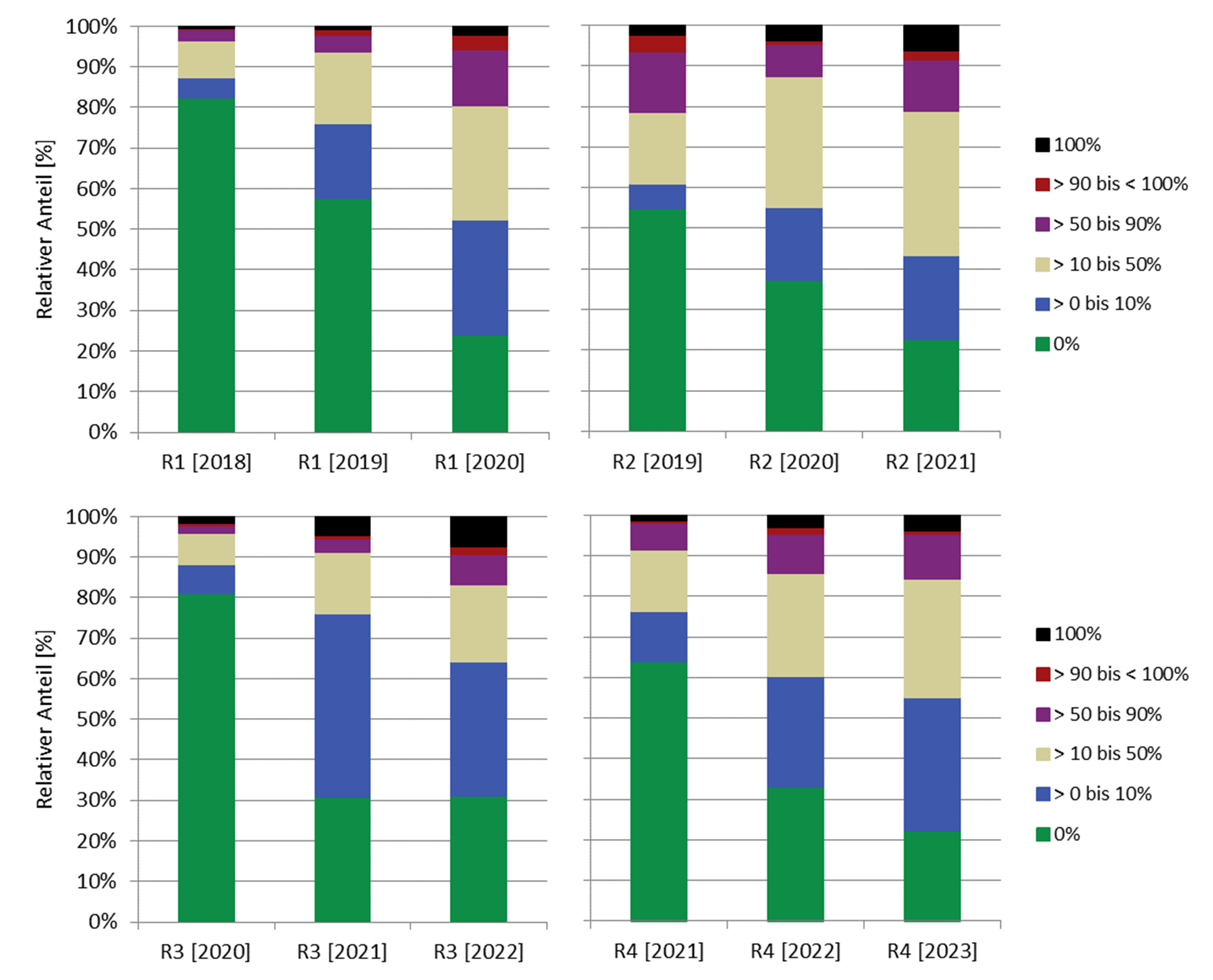 Abb. 3: Relativer Anteil an Nachkommen in den einzelnen Klassen der Triebsterbensintensität (% Schädigung durch das Eschentriebsterben) in den Resistenztests R1 bis R4 im BFW-Versuchsgarten. Auf jeder Teilversuchsfläche wurden die Schadansprachen in drei aufeinanderfolgenden Jahren, beginnend ein Jahr nach der Anlage, durchgeführt (z. B: Teilfläche R1: Anlage: 2017; Schadansprachen 2018, 2019 und 2020).