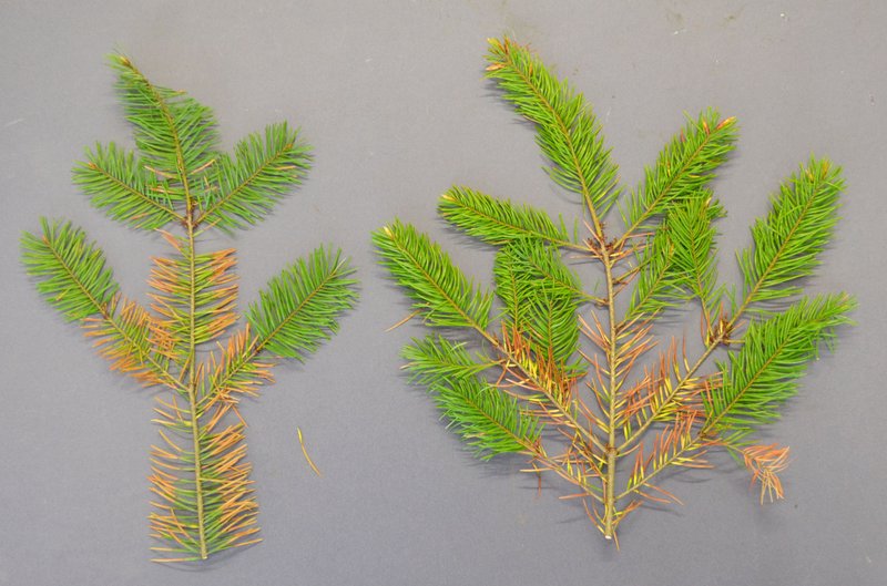 Abb.2. Triebe mit Rußiger Douglasienschütte und dadurch rötlich verfärbten abgestorbenen Nadeln älterer Nadeljahrgänge. Foto: NW-FVA, Abt. Waldschutz