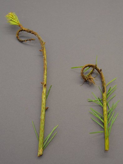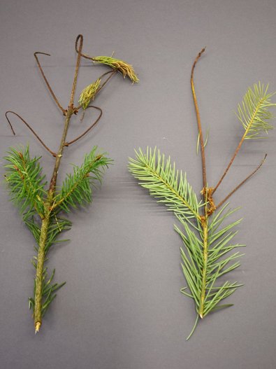 Abb. 3 und 4: Triebsterben an Douglasie, verursacht durch Diplodia sapinea. Foto: NW-FVA, Abt. Waldschutz