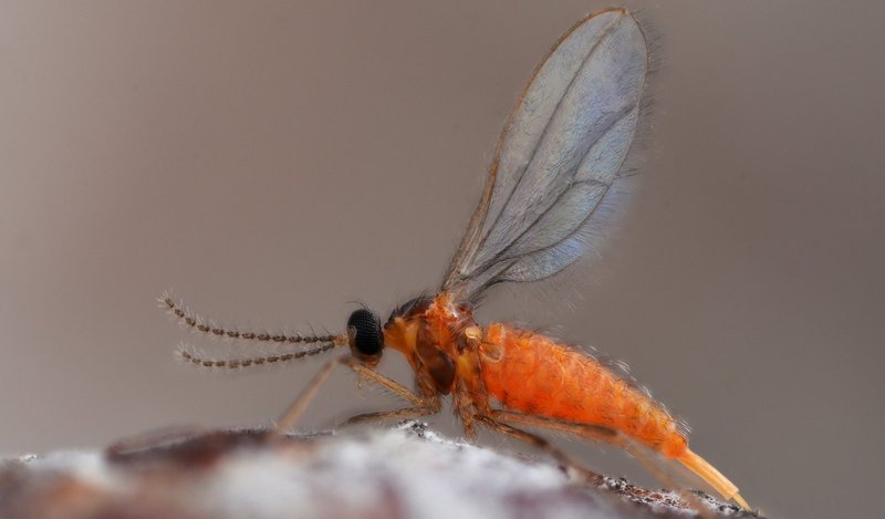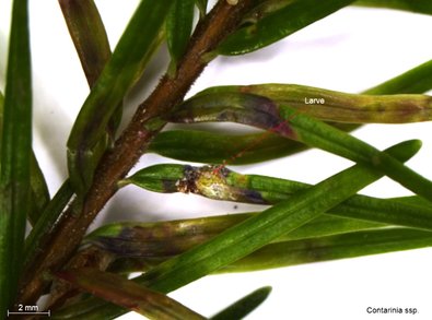 Die Larven der Gallmücken bohren sich in die frisch ausgetriebenen Nadeln und verursachen dadurch eine Gallenbildung. Befallene Nadeln sind verdickt und häufig gebogen. Anfangs haben die Nadeln eine blasse Farbe, werden aber im Laufe des Sommers dunkler und nehmen bis zum Herbst eine rötlich-braune Farbe an. Befallene Nadeln fallen frühzeitig ab. Die Larven überwintern im Boden unter befallenen Bäumen. Im Frühjahr legen die Weibchen ihre Eier in die sich öffnenden Knospen. Innerhalb weniger Tage schlüpfen die Eilarven und bohren sich in die Nadeln, wo sie den ganzen Sommer über fressen. Im Herbst verlassen sie die Nadeln und verpuppen sich im Boden. Adulte Gallmücken haben einen orange-farbenen Hinterleib und werden etwa 3 mm groß. Nach dem Schlüpfen kann man sie auf den Nadelspitzen beobachten. Mit ihrer langen Legeröhre legen die Weibchen die Eier zwischen die Schuppen der sich öffnenden Knospe. Auch die Eier sind orange-farben.