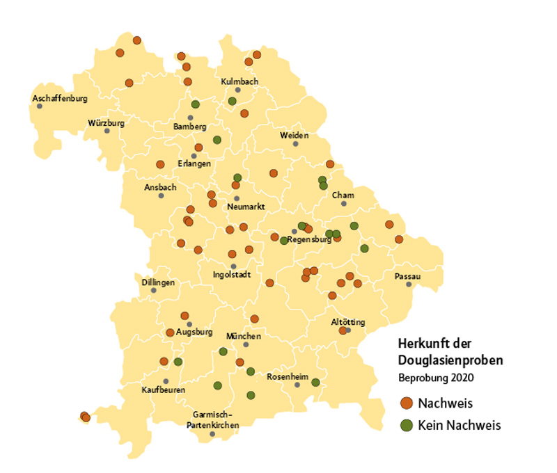 Bis 2020 gab es keinen offiziellen Nachweis von Contarinia pseudotsugae in Bayern. Im September 2020 veranlasste die Bayerische Landesanstalt für Wald und Forstwirtschaft daher eine Erhebung zum Nachweis der Douglasien-Gallmücke (Contarinia ssp.). An der Kontrollerhebung haben sich 32 Bayerische Ämter für Ernährung, Landwirtschaft und Forsten beteiligt. Dabei wurden zufällig gesammelte Douglasienzweige an die LWF geschickt und dort auf Befall durch die Gallmücke untersucht. Die Probennahme erfolgte im September, da zu diesem Zeitpunkt die einschlägigen Befallssymptome an der Douglasie am deutlichsten sichtbar sind. Zusätzlich wurden Daten zur Herkunft der Proben wie Alter, Beschirmung etc. abgefragt. Je Standort wurden ein bis sechs Proben gesammelt. Insgesamt schickten die Ämter 237 Zweigproben von 71 Probeorten ein.