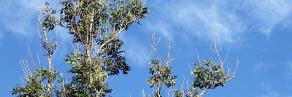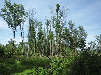 Abb. 1: Trotz hohem Infektionsdruck gering geschädigte Esche mit wahrscheinlich hoher Resistenz gegenüber dem Eschentriebsterben (im Bild links). Solche gering geschädigten Eschen sind für das Projekt "Esche in Not" von großem Interesse und sollen dem BFW unbedingt gemeldet werden.