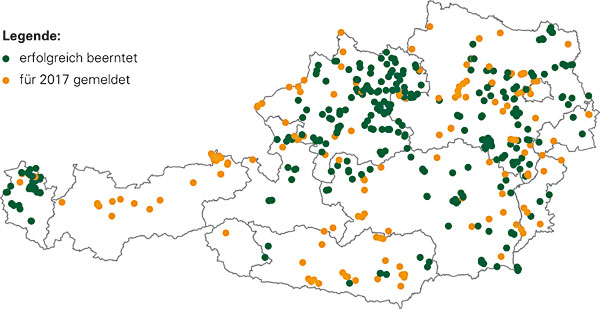 Im Juli 2015 erfolgte ein Aufruf zur Beteiligung an der Suche nach gesunden, samentragenden Eschen in vom Eschentriebsterben stark geschädigten Beständen. Dank der Mithilfe der Waldbesitzerinnen und Waldbesitzer sowie am Wald Interessierte konnten 566 Standorte (Abb. 4) aufgesucht und von 580 Einzelbäumen Saatgut gewonnen werden. Dieses wurde noch im Herbst 2015 im Versuchsgarten des BFW ausgesät. Bereits im ersten Jahr nach der Aussaat konnten 6.388 Eschen angezogen werden. Die für die Resistenzprüfung geplante Anzahl von 60 Nachkommen pro Mutterbaum wird 2017 nach der Keimung des überliegenden Saatgutes aus dem Jahr 2015 erreicht. Im Spätwinter oder Frühjahr 2017 wird mit der Anlage des Feldversuches zur Testung der Resistenz der Einzelbaumnachkommenschaften begonnen, der später sukzessive erweitert werden wird.