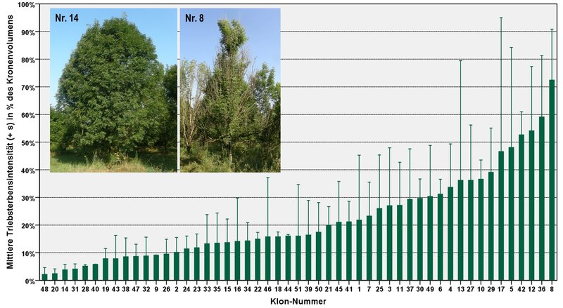 Abb. 2: Große Variation in der Anfälligkeit von Genotypen gegenüber dem Eschentriebsterben in der Samenplantage Feldkirchen an der Donau (Oberösterreich), dargestellt durch die mittlere Triebsterbensintensität (+ Standardabweichung) in Prozent geschädigter Krone an den 51 Eschen-Klonen (2 - 4 Bäume pro Klon, insgesamt 184 Bäume; Erhebung: 3. und 4. Juni 2015).