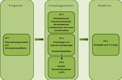 Im Waldschutz-Klimaprojekt der Bayerischen Landesanstalt für Wald und Forstwirtschaft (LWF) werden Maßnahmen zur Erhaltung der Reaktionsfähigkeit entwickelt. Diese beruht auf rechtzeitigem Erkennen von Gefährdungssituationen durch effiziente Monitoring- verfahren und benötigt effektive Vermeidungs- und Bekämpfungsstrategien. Unterteilt ist das Waldschutz-Klimaprojekt in fünf Arbeitspakete (AP 1 bis 5), die aufeinander aufbauen und untereinander verknüpft sind (Abb. 2).