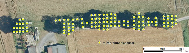 Bei diesem Versuch, der in Kooperation mit der Unteren Naturschutzbehörde Hamm stattfindet, werden die im Wein- und Obstbau praxiserprobten Verfahren auf eine mit EPS befallene Eichenallee in Hamm-Bockum übertragen. So wurden im Juli 2020 500 EPS-Pheromondispenser je Hektar vor dem Hochzeitsflug der Falter direkt in den Baumoberkronen platziert. Ein Dispenser deckt also eine Fläche von 20 m2 ab. Damit erzeugen die quasi wie an einer Perlenkette im Abstand von 4,5 m an Schnüren befestigten Dispenser eine flächendeckende "Pheromonwolke". Um die Gefahr von Zufallstreffen der Sexualpartner möglichst gering zu halten, wurden die EPS-Nester in der Eichenallee vor der Durchführung des Versuchs abgesaugt und dies dokumentiert. In der Vergangenheit hat sich gezeigt, dass allein das Absaugen der Nester nicht zu einem Rückgang des EPS-Befalls im nächsten Jahr führt. Ziel ist es, die EPS-Populationsdichte auf einen Minimalwert zu senken.