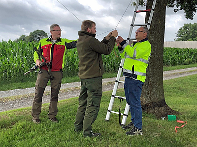 Abb. 3: Mit der Armbrust wurden die Schnüre mit den Dispensern über die Eichenkronen geschossen – die beiden Enden der Bastschnur wurden zusammengeknotet und am Stamm der Eiche auf ca. 3 m Höhe befestigt. Foto: M. Jakoby