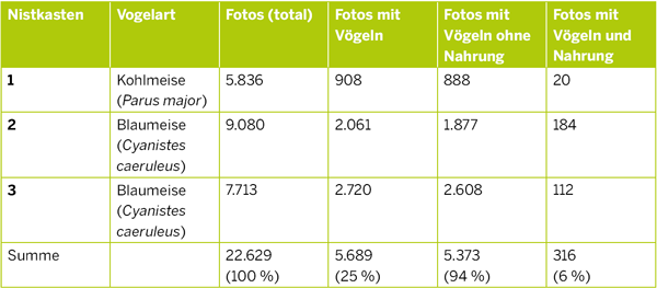 Während des Untersuchungszeitraums von Anfang April bis Ende Mai 2020 wurden insgesamt 22.629 Fotografien aufgenommen und ausgewertet. Auf rund 75 % der Bilder sind keine Vögel abgelichtet, weil der Bewegungsmelder häufig durch Wind und sich bewegendes Laub ausgelöst wurde. Auf 5.689 Bildern mit Vögeln wurden bei 6 % Vögel mit Nahrung im Schnabel fotografiert. Detaillierte Ergebnisse sind der Tabelle 1 zu entnehmen.