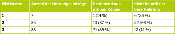 Tabelle 1: In den Anfang April angebrachten Nistkästen haben folgende Vogelarten gebrütet. Die Aufnahmen sind ausgewertet und wie folgt differenziert worden.