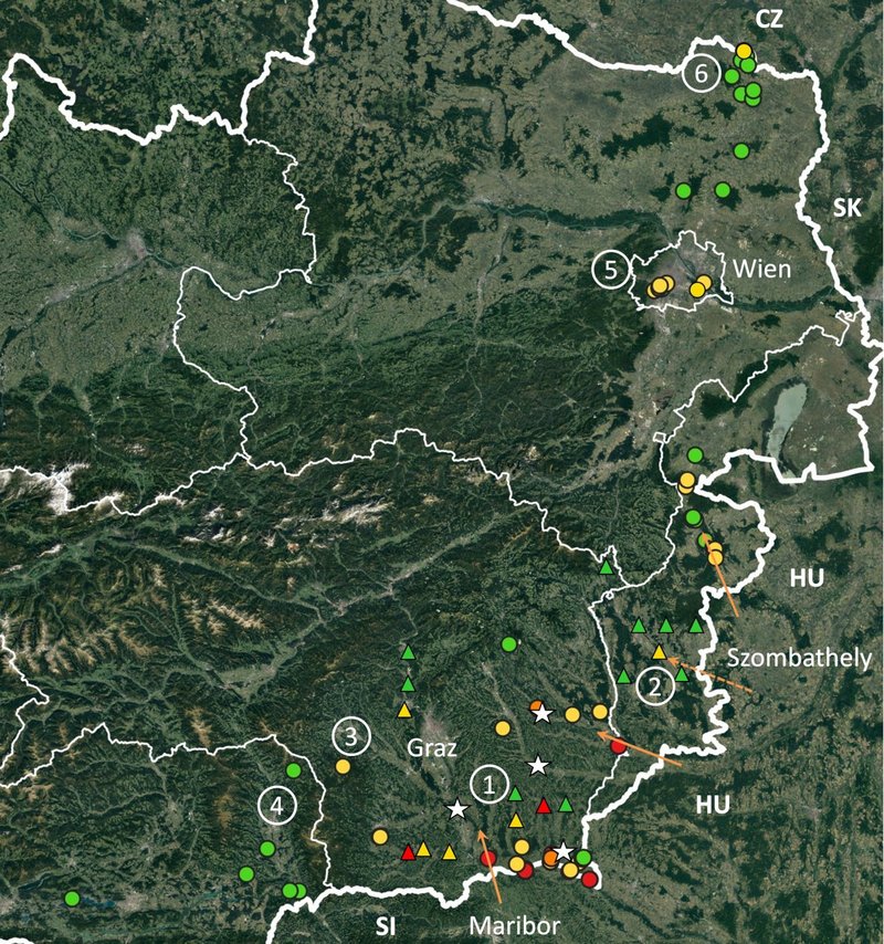 Abb. 1: Vorkommen von Corythucha arcuata in Österreich, basierend auf den Surveys 2019 (weiße Sterne), 2020 (Dreiecke) und 2021 (Punkte). Die Farben bei Dreiecken und Punkten kennzeichnen die Intensität des Befalles: grün = nicht befallen, gelb < 10 %, orange 10-39 %, rot ≥ 40 % der Krone befallen. Die orangen Pfeile markieren vermutliche Hauptrouten für die Einwanderung nach Österreich (strichliert = geringere Intensität des Befalls). Erklärungen zu den Ziffern (1) bis (6) im Text. Satellitenfoto: Google Earth, Image Landsat / Copernikus.