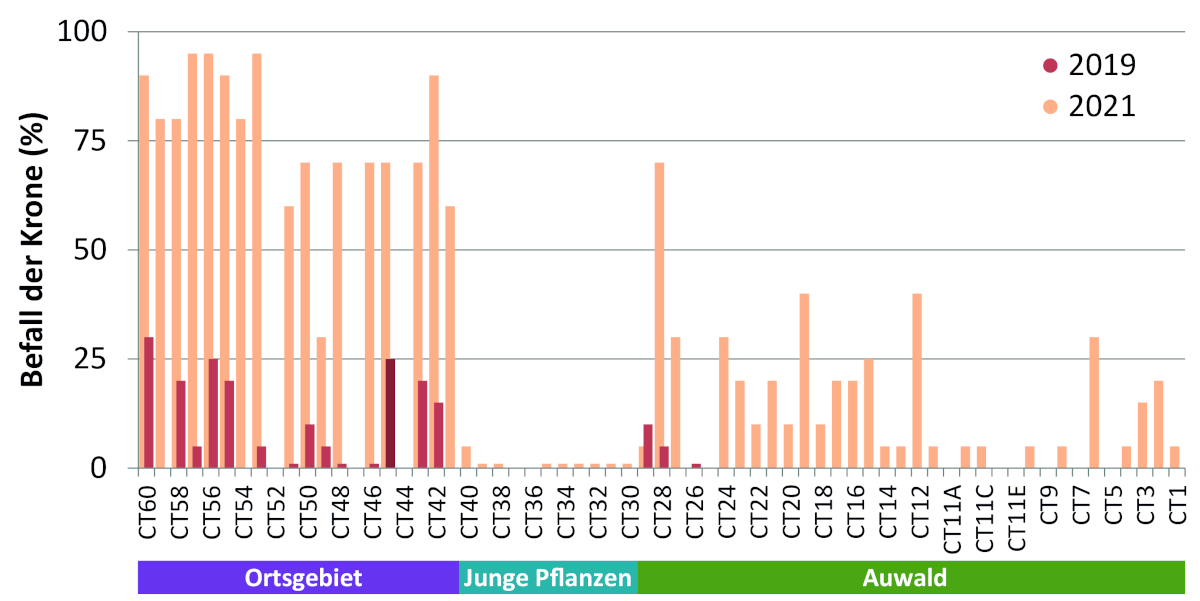 Während in Ersterem auch entfernt gelegene Bäume befallen waren (Abb. 1, Ziffer 1), war C. arcuata im neuen Ausbreitungsgebiet in Verbindung mit Verkehrs- und Gewerbeinfrastruktur anzutreffen (Abb. 1, Ziffer 2).