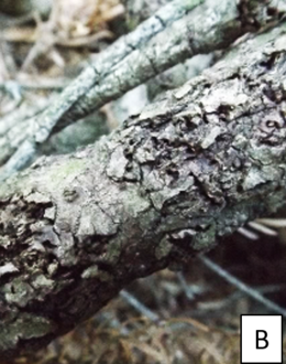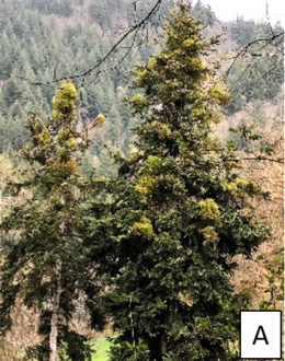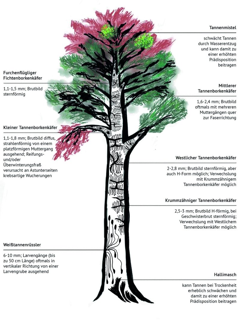 Eine Reihe rindenbrütender Schadorganismen profitiert von Vorschädigungen des Wirtsbaumes durch Trockenheit (Abb. 3 und 4). Als die schadrelevantesten Arten, die sogenannten "Big Five", gelten der Krummzähnige (Pityokteines curvidens), der Westliche (Pityokteines spinidens), der Mittlere (Pityokteines vorontzovi) und der Kleine Tannenborkenkäfer (Cryphalus piceae) sowie der Weißtannenrüssler (Pissodes piceae). Daneben können auch Borkenkäferarten wie der Furchenflüglige Fichtenborkenkäfer (Pityophthorus pityographus) im Kronenmaterial und in Tannenverjüngungen vorkommen. Häufig verstärken zudem Hallimasch (Armillaria spp.) und Tannenmistel (Viscum album subsp. abietis) das Schadgeschehen.