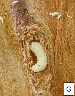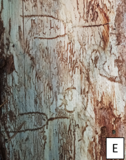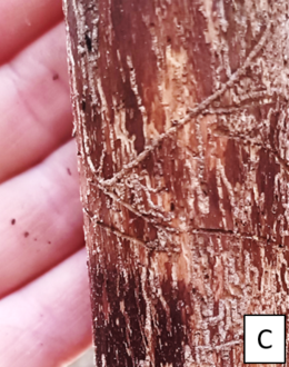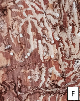 Abb. 5: Westlicher Tannenborkenkäfer an Douglasie; links: bereits deutlich zeichnende Douglasie, Mitte: Brutbilder mit durchentwickelten Stadien, rechts: Larven und adulter Westlicher Tannenborkenkäfer im Brutbild (Fotos: Main-Tauber-Kreis/Utz, 2022)